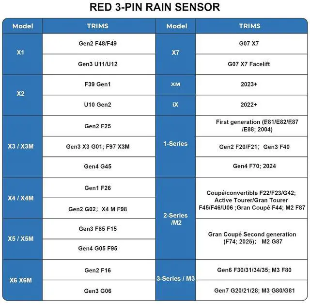 Only compatible with BMW vehicles with a factory-installed rain sensor using a dedicated, powered 3-Pin connector inside the original sensor cover. Vehicles without a rain sensor, with an integrated sensor and no separate plug, or other 3-Pin connectors that may fit, will NOT connect or power on.