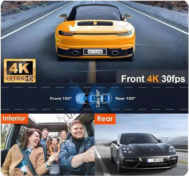 4K Dash Cam3 Channel Dash Cam can record videos in front UHD 4K (3840*2160P), and rear FHD 1080P (1920*1080P) resolution, clearly capturing license plates and road signs. With a 170° front view, 120° cabin view, and 150° rear view, the triple dashcam ensures you never miss a moment and stay protected with 360° full-protection.