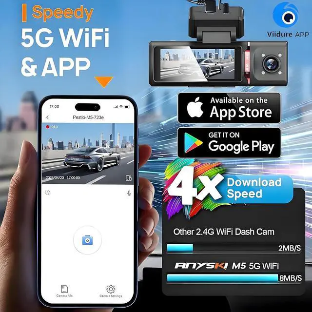 Dash Cam Front and RearEnjoy fast video download speeds of up to 8MB/s, and the built-in 5GHz WiFi gives you fast access, enabling instant access to recorded content and driving directions on your smartphone. Support simultaneous video playback in front of/inside/behind the car and easily share your travel experience with family, friends and social media with a single click.