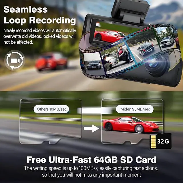 Dash camera for CarsEquipped with a detachable 32GB card, it offers plenty of video storage space, ensuring you capture every important moment on the road. (Note: SD cards need to be formatted before first use. ) The loop recording function automatically overwrites the oldest files when storage is full, and the G-sensor automatically detects collisions and locks the recording, protecting critical evidence from being overwritten.