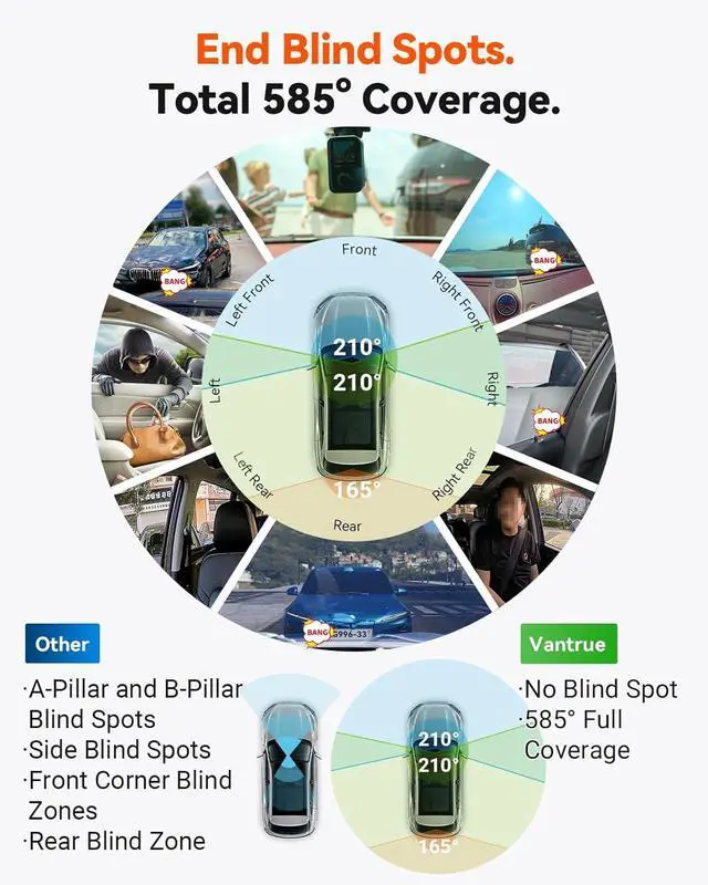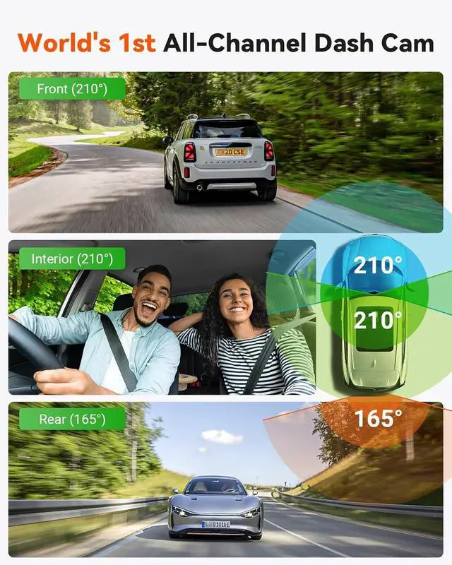 [ Revolutionary All-Channel Full Coverage ] The Vantrue E360 Plus all channel dash cam redefines driving safety as the industry' s first all-channel dash cam. Its ultra-wide system (Front 210°+ Interior 210°+ Rear 165°) captures the front, cabin, and rear in crystal-clear detail simultaneously. Enjoy 150% wider coverage than standard 4-way dashcams for cars for total protection while driving or parked, documenting every moment from exciting new perspectives.
