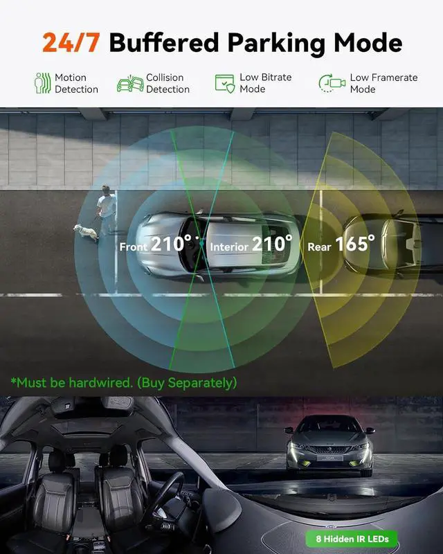 [ 24/7 Protected Parking Monitor ] Automatically record break-ins, hit-and-runs, or suspicious activity within 20 ft of your parked vehicle. With 4 parking modes, this robust car security camera captures complete events and provides vital evidence. (*For 24/7 operation, requires hardwiring cable sold separately, ASIN: B083XB8T7T*)