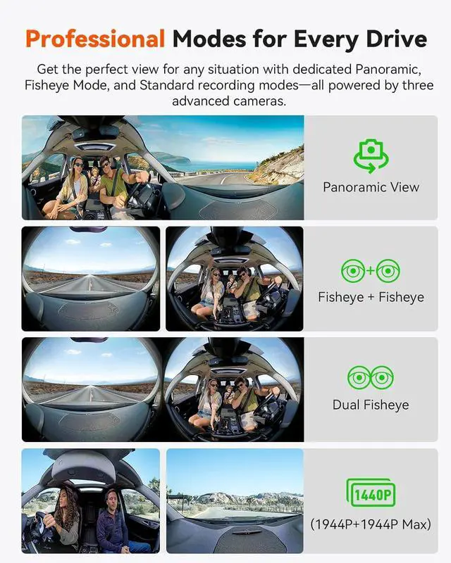 [ Dual Fisheye Lenses: True " Bird' s-Eye" View ] Our dual 210° fisheye lenses and exclusive Panovis stitching technology create a seamless, ultra-wide " bird' s-eye" view. This unique perspective covers parts of the hood and both A-pillars, capturing side-front vehicles and their position during collisions, making accident liability clear and indisputable.