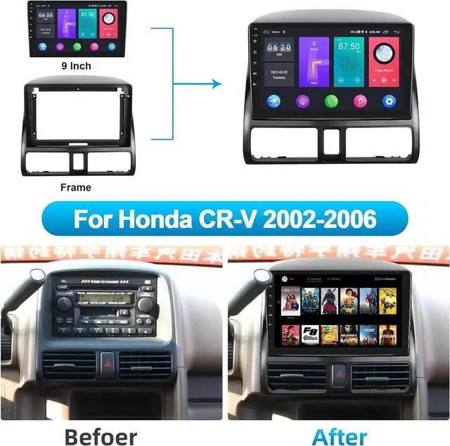 Suitable for Honda CRV 2002-2006 Suitable for Honda CRV 2002 2003 2004 2005 2006, using the latest Android 13.0 system, 1+32G memory, you can enjoy a smooth and responsive user experience. The 9-inch high-definition anti-blue light touch screen speaker brings you visual enjoyment and ultra-sensitive touch screen response. [Note: Please check the year, size and shape of your vehicle' s center console before purchasing, we will process it within 24 hours. ]