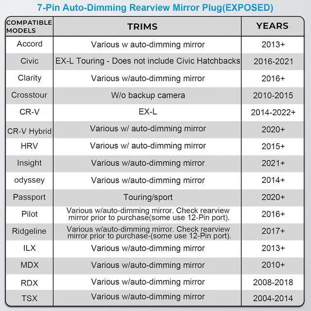 Compatibility notes: Confirm that your vehicle has an autodimming mirror, as this is necessary for our products. Refer to the compatibility chart below to see if your vehicle is included. Keep in mind, this chart serves as a guideline, and cars not listed may still be compatible. If your vehicle is not listed, inspect the mirror connector where the original wiring plugs in. Compare the number and arrangement of pins to the product images to determine if they match.