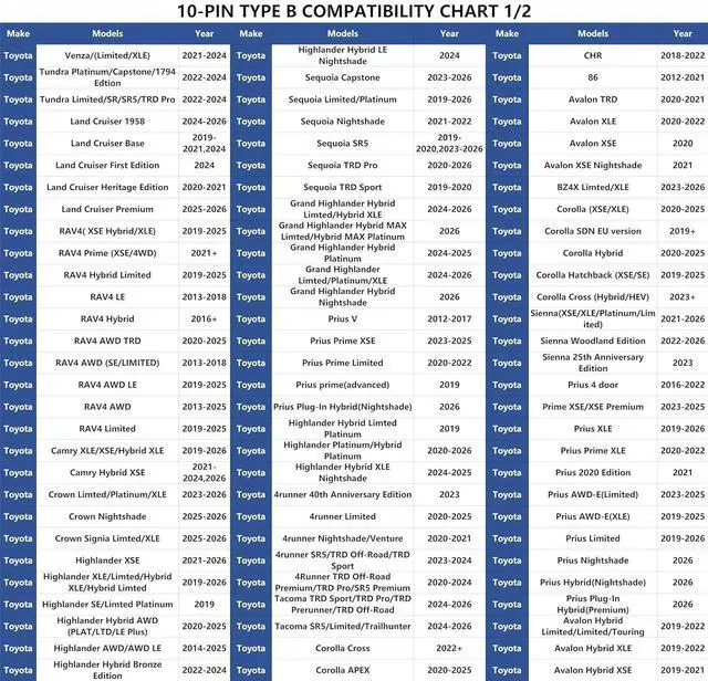 Compatibility NoticeThis product ONLY fits 10-Pin Type B connectors. Some models (e. g., Toyota RAV4, Highlander, Sienna, Corolla, Subaru Outback) may have either 10-pin Type B or 12-pin Type C depending on trim/options. Please check your rearview mirror connector BEFORE ordering count the pins to ensure it' s 10-pin. Do NOT rely solely on vehicle model/year.