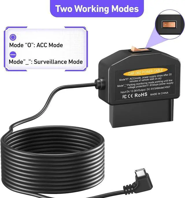 Two Work Modes OBD2 Dash Cam Power Cable- OBD power cable for dash camera type c with one-button operation. Mode " O" ACC mode - When the car is ignited, power cord begins to output power; After the car is turned off for 20 minutes, OBD power cable will automatically stop supplying power and turn off the output. Mode " -"; Monitor the working mode, with the obd2 dash cam adapter usb c continuously supplying power for 24 hours, and maintain operation until low battery voltage ( 11.7V )