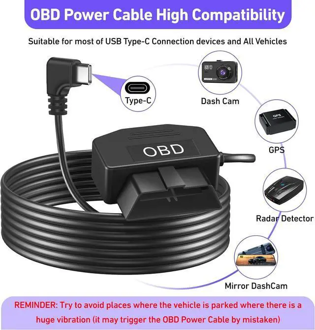 • Precautionary Note for OBD Power Adapter- 1.Try to avoid places where the vehicle is parked where there is a huge vibration (which may falsely trigger the obd 2 type c power cable). 2.The USB Type-C connector of this obd ii power cable uses A5-B5 signal pins and may not be compatible with some dash cam brands use A8-B8 signal pins. 3.dash cam power adapter obd suitable for all Type-C port electronic devices generally. (May not work with some phone charging protocol)