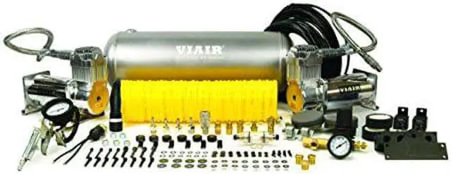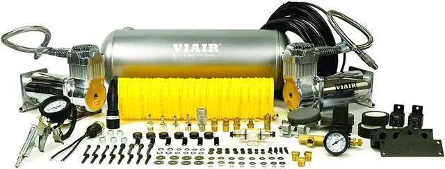 VIAIR’s Dual 400C Onboard Air System is a pre-packaged compressed air solution that provides two 400C, 33% duty cycle compressors, a 2.0 gallon air tank, inline pressure regulation, and all components needed to install a working system capable of inflating tires, managing air locking differentials, and more.