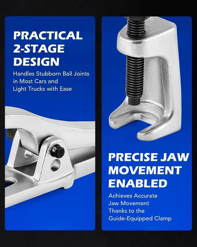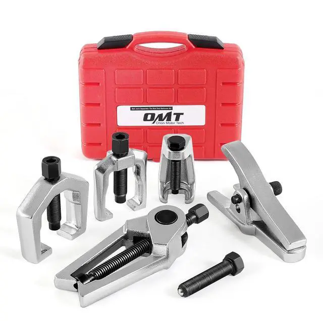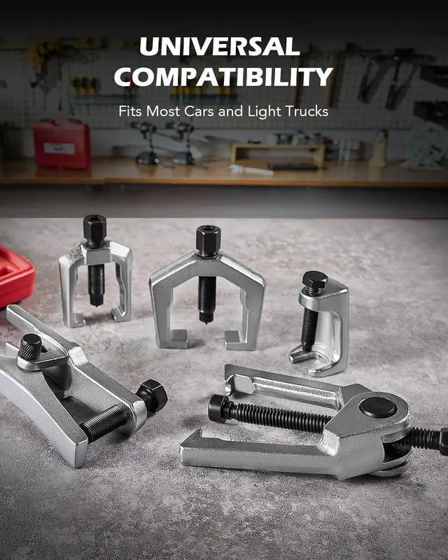 This front end service kit, including five tools made of heat-treated alloy steel, is used to remove pitman arms, tie rods, and ball joints on most vehicles. In different shapes and sizes, with great strength and durability, these pullers can remove even the most stubborn pitman arm or tie rod. The press-type ball joint separator, unlike the fork-type, will remove the ball joint without damaging the car boots or any other parts. The whole tool set can be very useful for professional automobile mechanics.