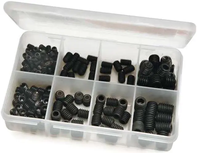 Socket Set Screw Assortment, Socket Head Cap Screw Head Type Not Applicable, Number of Pieces 195, System of Measurement Inch, Thread Size #10-24, 1/4 In. -20, 3/16 In. -24, 3/8 In. -16, 5/16 In. -18, Screw Size #10; 1/4 in; 3/8 in; 5/16 in, Number of Sizes 6, Drive Type Socket, Material Alloy Steel, Finish Black Oxide, Pack Size Small Pack, Special Features Not Applicable, Container Height 1 1/2 in, Container Length 5 1/4 in, Container Material Plastic, Container Width 3 1/4 in.
