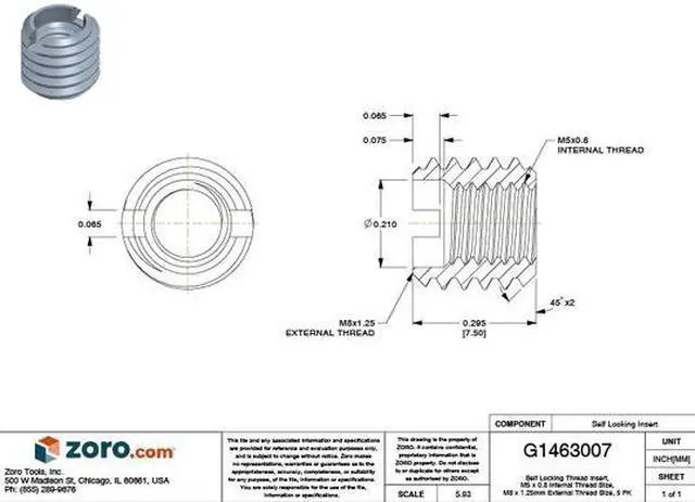 Self Locking Thread Insert, Compatible Material Metal, Compatible Tap Size M8- 1.25, Drill Bit Size 6.90 mm, External Thread Fit 6G, External Thread Size M8- 1.25, Finish Plain, Insert Diameter 7.5 mm, Internal Thread Fit 6H, Internal Thread Size M5- 0.80, Material Stainless Steel, Material Grade/Class 18-8, Maximum Hole Diameter 6.9 mm, Minimum Installation Depth 9 1/8 mm, Overall Length 7 mm, System of Measurement Metric, Thread Direction Right Hand, Thread Type Metric, Wall Type Heavy Wall. This item has been restricted from sale in the following state (s): []