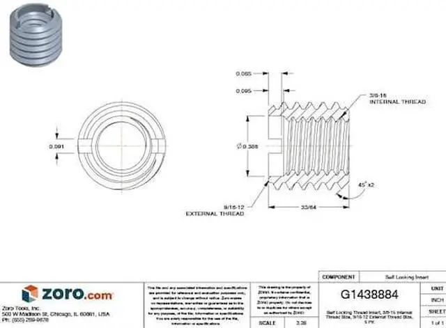 Self Locking Thread Insert, Compatible Material Metal, Compatible Tap Size 9/16 In. -12, Drill Bit Size 31/64 in, External Thread Fit 2A, External Thread Size 9/16 In. -12, Finish Plain, Insert Diameter 9/16 in, Internal Thread Fit 2B, Internal Thread Size 3/8 In. -16, Material Stainless Steel, Material Grade/Class 18-8, Maximum Hole Diameter 0.484 in, Minimum Installation Depth 19/32 in, Overall Length 33/64 in, System of Measurement Inch, Thread Direction Right Hand, Thread Type Coarse. This item has been restricted from sale in the following state (s): []