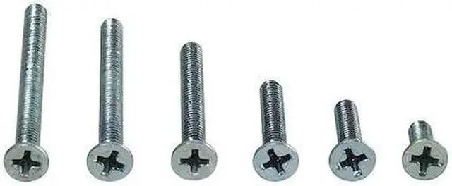 Flat head, assorted sizes and lengths of commonly used electrical machine screws. Slotted flat head screws for all-purpose electrical fastening.