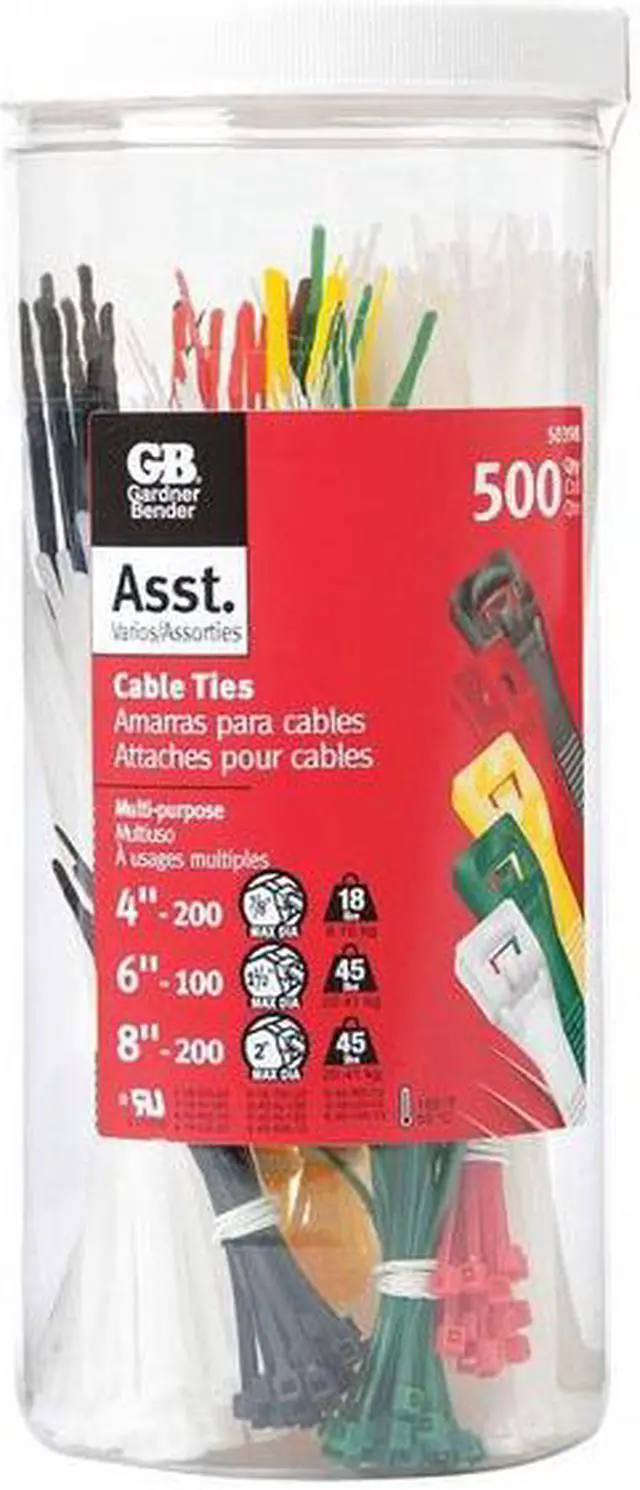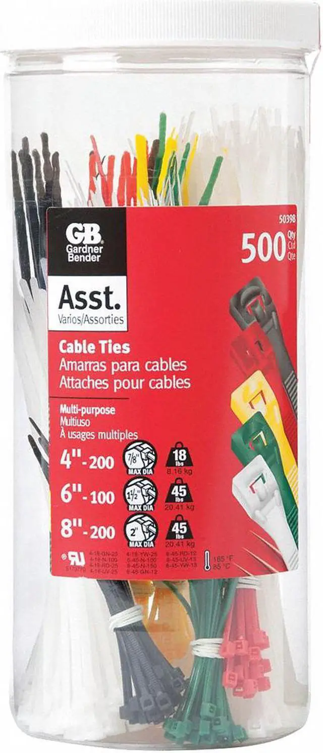 Cable Tie Kit, Standard, Color Assorted Colors, Number of Pieces 500, Material Nylon 6/6, Cable Tie Properties UV Light Resistant, Actual Length 4 in, 6 in, 8 in, Temp. Range -40 Degrees F to 185 Degrees F, Standards UL Listed, Includes (100) 4.0 in Natural, (100) 6.0 in Natural, (100) 8.0 in Natural, (25) 4.0 in Black, (25) 4.0 in Green, (25) 4.0 in Red, (25) 4.0 in Yellow, (25) 8.0 in Black, (25) 8.0 in Green, (25) 8.0 in Red, (25) 8.0 in Yellow, UL Type 21, Outdoor Use Yes, Flame Retardant No.