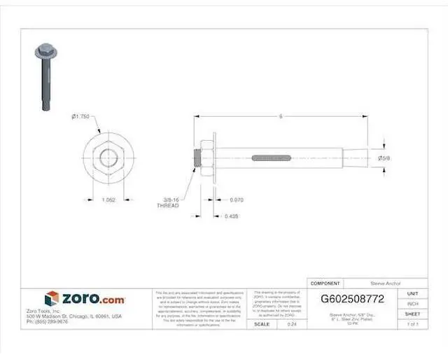 MIDWEST FASTENER 07852 Sleeve Anchor, 5/8" Dia., 6" L, Steel Zinc Plated, 10 PK