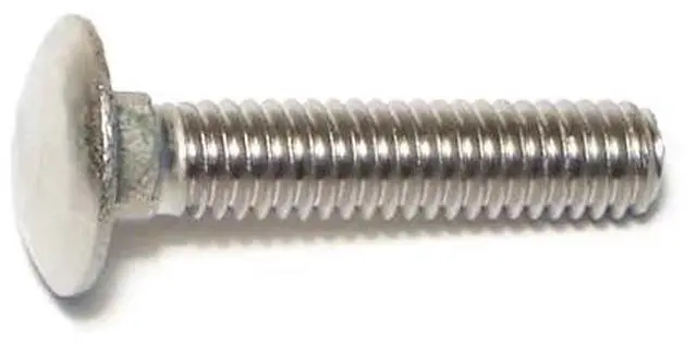 A carriage bolt has a domed or countersunk head, and the shank is topped by a short square section under the head. The square section grips into the part being fixed (typically wood), preventing the bolt from turning when the nut is tightened.