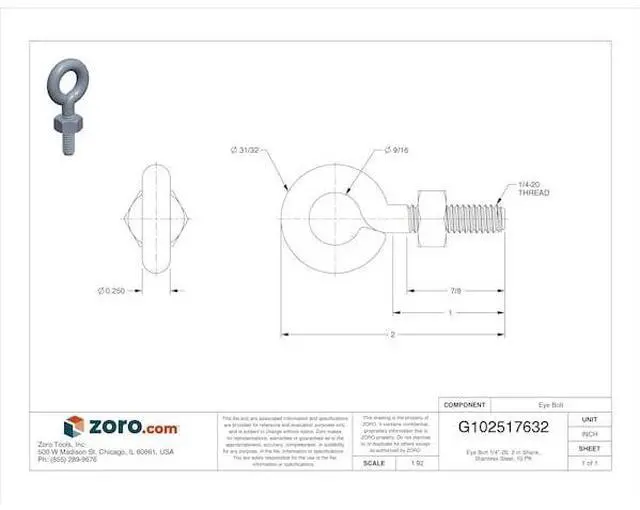 MIDWEST FASTENER 52324 Eye Bolt 1/4"-20, 2 in Shank, Stainless Steel, 10 PK