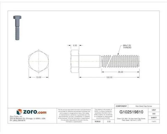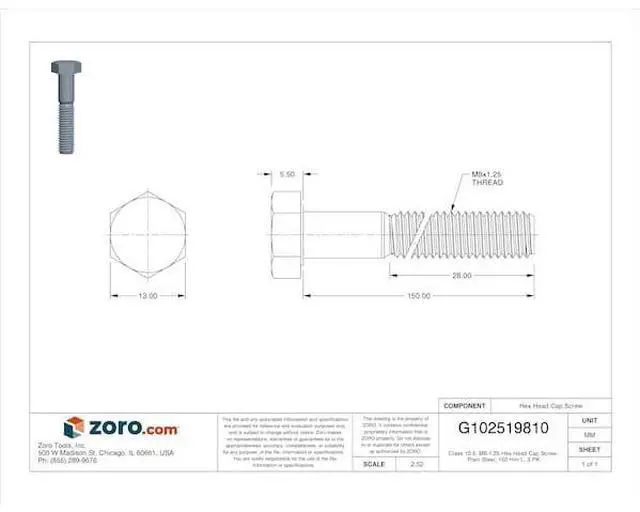 MIDWEST FASTENER 73786 Class 10.9, M8-1.25 Hex Head Cap Screw, Plain Steel, 150