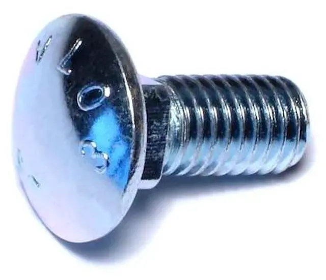 A carriage bolt has a domed or countersunk head, and the shank is topped by a short square section under the head. The square section grips into the part being fixed (typically wood), preventing the bolt from turning when the nut is tightened.