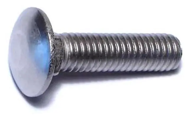 A carriage bolt has a domed or countersunk head, and the shank is topped by a short square section under the head. The square section grips into the part being fixed (typically wood), preventing the bolt from turning when the nut is tightened.