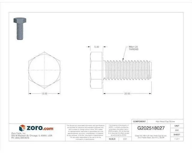 MIDWEST FASTENER 50443 Class 8.8, M8-1.25 Hex Head Cap Screw, Zinc Plated