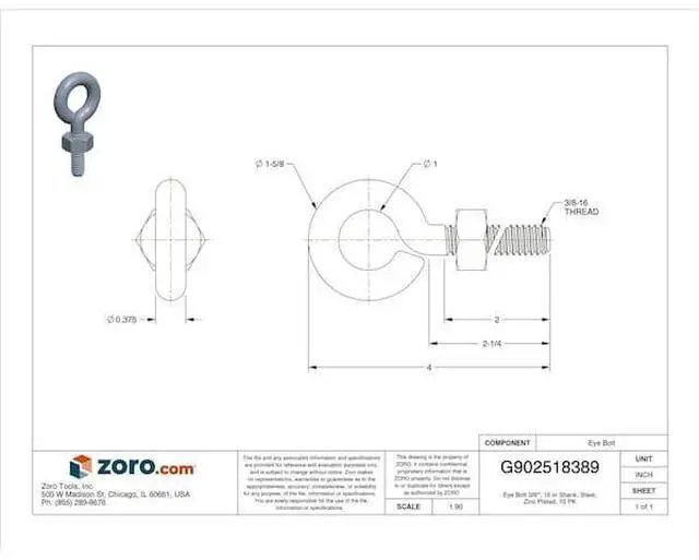 MIDWEST FASTENER 51713 Eye Bolt 3/8", 16 in Shank, Steel, Zinc Plated, 10 PK