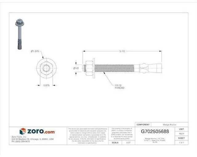 MIDWEST FASTENER 04130 Wedge Anchor, 1/2" Dia., 5-1/2" L, Steel Zinc Plated, 25