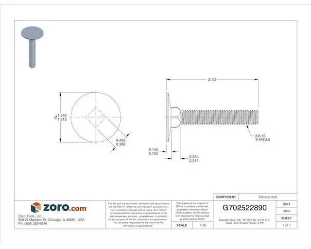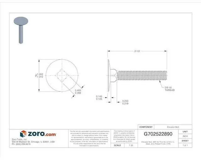 MIDWEST FASTENER 71325 Elevator Bolt, 3/8"-16 Thrd Sz, 2-1/2 in L, Steel, Zinc