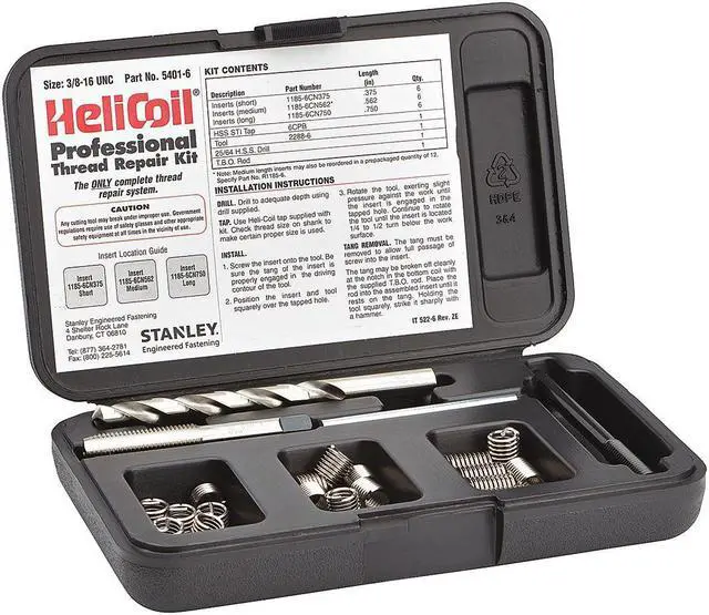 Thread Repair Kit, Insert Types Included Helical Inserts, Compatible Material Metal, Drill Bit Sizes Included 25/64 in, Finish Plain, Helical Insert Type Free-Running, Insert Length 3/8 in, 9/16 in, 3/4 in, Insert Material Stainless Steel, Material Grade/Class 18-8, Maximum Hole Diameter Not Applicable, Number of Inserts 18, Number of Pieces 22, Number of Sizes 3, System of Measurement Inch, Tang Style Tanged, Tap Sizes Included 3/8 In. -16, Thread Direction Right Hand, Thread Size 3/8 In. -16. This item has been restricted from sale in the following state (s): []