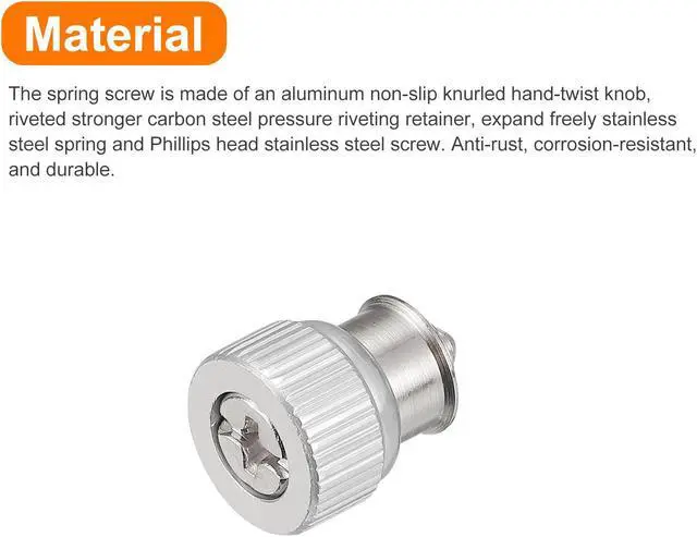 1. Material: The spring screw is made of an aluminum non-slip knurled hand-twist knob, riveted stronger carbon steel pressure riveting retainer, expand freely stainless steel spring and Phillips head stainless steel screw. Anti-rust, corrosion-resistant, and durable.