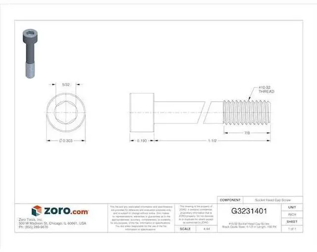 Socket Head Cap Screw, Head Style Standard, Alloy Steel, Finish Black Oxide, Thread Size 10-32, Drive Type Hex Socket, Drive Size 5/32 In, Decimal Equivalent 0.156 In, Thread Type UNF, Thread Style Partially Threaded, Thread Direction Right Handed, Length under Head 1 1/2 In, Thread Length 7/8 In, Head Height 0.190 - 0.185 In, Head Dia 0.312 - 0.303 In, Class 3A, Rockwell Hardness RC 38-43, Min Tensile Strength 180, 000 PSI, Meets/Exceeds ASTM A574/ANSI B 18.3, Package Quantity 100 RestrictionsNote: Zinc-plated socket head cap screws are available on DrillSpot.com . Thread lengths for partially threaded screws are minimum values; lengths may vary. Camcar/Kerr LakesideMeet ASTM A574/ASME B18.3 standards for Kerr Lakeside.Tensile strength: 180,000 psi up to 1/2"; 170,000 psi over 1/2" Rockwell hardness: (Camcar) RC38 to 43; (Kerr Lakeside) C39Alloy Steel Socket Head Cap ScrewsMeet ASTM A574/ANSI B18.3 standards.Thread class: 3A right-hand threads Black oxide finish