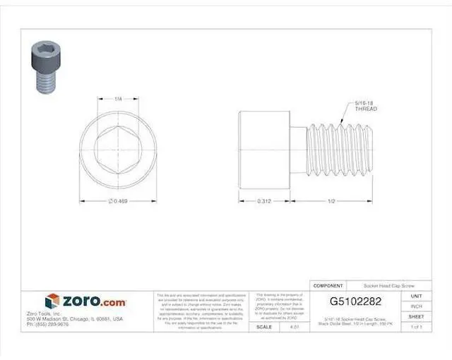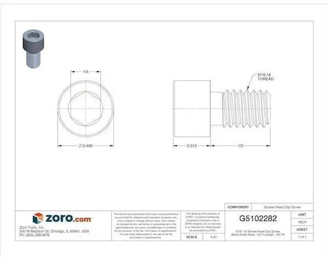 Socket Head Cap Screw, System of Measurement Inch, Cylindrical, Basic Material Steel, Material Grade Alloy Steel, 5/16 In.-18, Length 1/2 In., Fastener Finish Black Oxide, Fastener Thread Type UNC (Coarse), Drive Type Hex Socket, Drive Size 1/4 In., Thread Style Fully Threaded, Thread Direction Right Hand, Thread Length 1/2 In., Head Height 0.312 - 0.306, Thread Dia. 5/16 In., Package Quantity 100