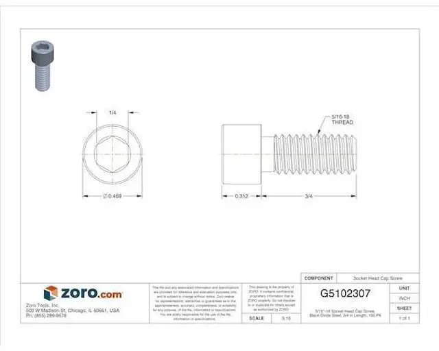 Socket Head Cap Screw, System of Measurement Inch, Cylindrical, Basic Material Steel, Material Grade Alloy Steel, 5/16 In.-18, Length 3/4 In., Fastener Finish Black Oxide, Fastener Thread Type UNC (Coarse), Drive Type Hex Socket, Drive Size 1/4 In., Thread Style Fully Threaded, Thread Direction Right Hand, Thread Length 3/4 In., Head Height 0.312 - 0.306, Thread Dia. 5/16 In., Package Quantity 100