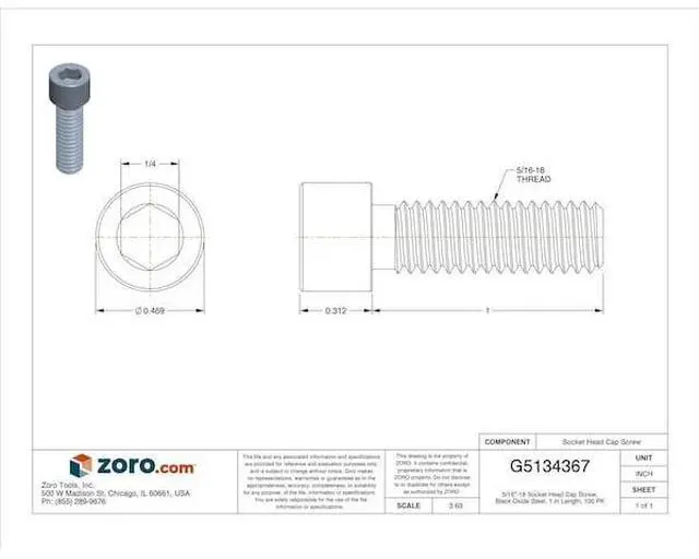 Socket Head Cap Screw, System of Measurement Inch, Cylindrical, Basic Material Steel, Material Grade Alloy Steel, 5/16 In.-18, Length 1 In., Fastener Finish Black Oxide, Fastener Thread Type UNC (Coarse), Drive Type Hex Socket, Drive Size 1/4 In., Thread Style Fully Threaded, Thread Direction Right Hand, Thread Length 1 In., Head Height 0.312 - 0.306, Thread Dia. 5/16 In., Package Quantity 100