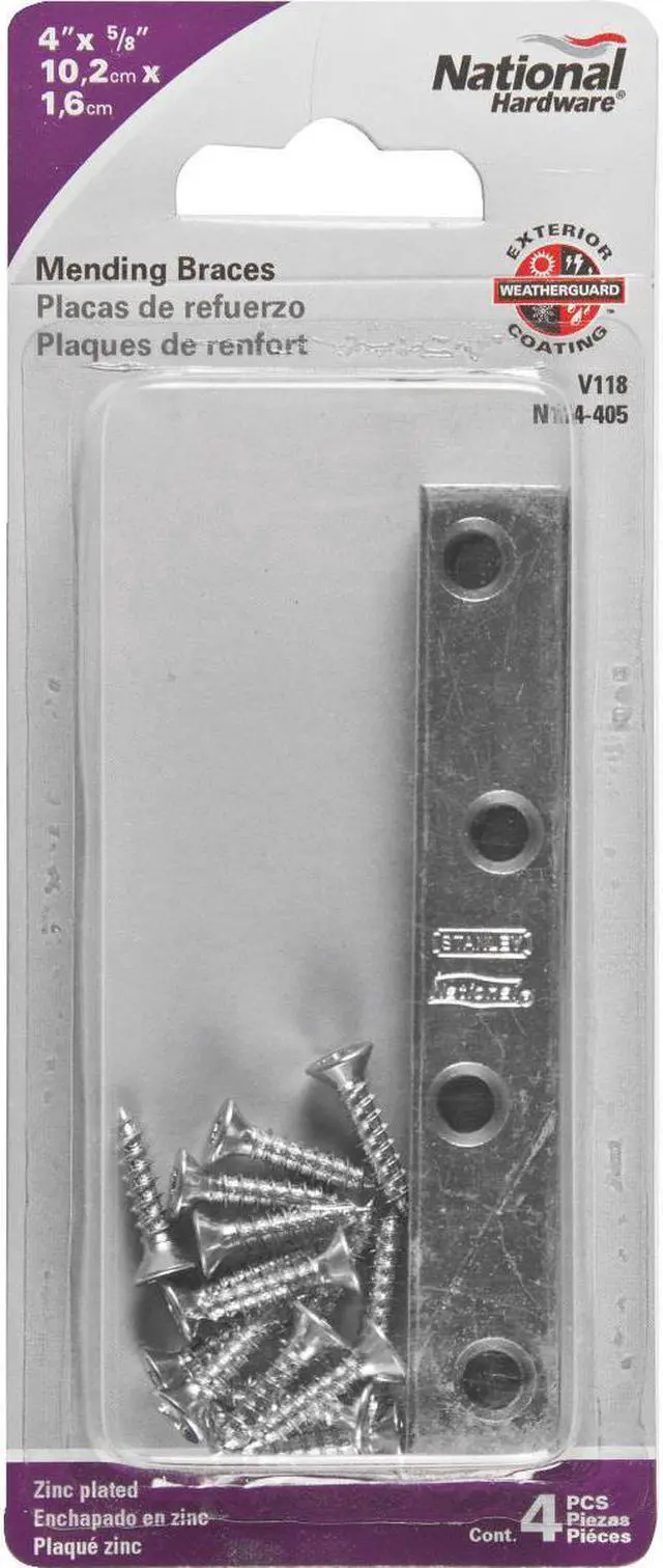 National Catalog Model No. 118 thru V118. This mending brace is designed for reinforcing, attaching, connecting, and splicing panels and other home and industrial applications. Straight design allows for fast and easy surface repairs to general household items. Screw holes are countersunk. Manufactured from hot rolled steel.