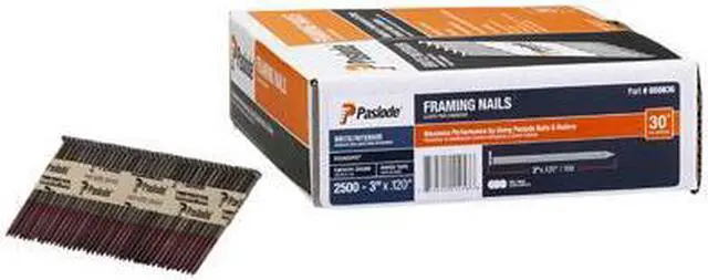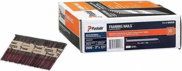 Framing Nails, 3 In. L, Plain, PK2500, Overall Length 3 in, Shank Diameter 3 in, Gauge 11 ga, Product Type Framing Nails, Material Steel, Finish Plain, Penny Size 10D, Head Type Flat, Head Diameter 1/8 in, Shank Type Smooth, Point Type Diamond, Collation Type Tape, Collation Configuration Strip, Collation Angle 30 Degrees, Collation Quantity 51, For Use With 501000, 502000, 513000, Mfr. No. 906300, Pack Size Bulk Pack, Manufacturer Location Globally Sourced.