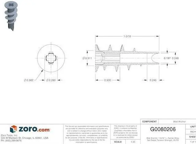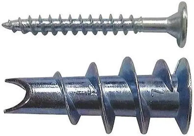 Wall Anchor, System of Measurement Inch, Anchor Length 1 5/16 in, Anchor Diameter 1/2 in, Thread Size #8, Thread Length 1 1/2 in, Drive Type Combination Slotted/Phillips, Flange Style Con Brida, Head Type Flat, Includes Screw Yes, Screw Size Included #8, Screw Length Included 1 1/2 in, Compatible Screw Size #6 to #10, Compatible Screw Length 1 1/2 in, Color Blue, Finish Zinc Plated, Material Zamac Alloy, Compatible Material Drywall, Drill Bit Size 1/2 in, Minimum Material Thickness 3/8 in.