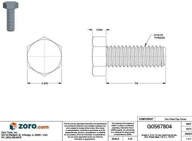 California Proposition 65: This product contains a chemical known to the State of California to cause birth defects or other reproductive harm. Hex Head Cap Screw, System of Measurement Inch, Basic Material Steel, Material Grade Grade 5, Fastener Finish Zinc Plated, Dia. /Thread Size 5/16 In. -18, Fastener Length 7/8 in, Fastener Thread Direction Right Hand, Fastener Thread Type UNC (Coarse), Fastener Thread Style Fully Threaded, Fastener Industry Standards ASME B 18.2. 1, Head Type Hex, Min. Thread Length 7/8 in, Head Height 13/64 in, Head Width 1/2 in, Package Quantity 100. This item has been restricted from sale in the following state (s): []