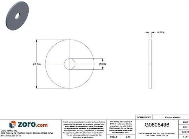 Fender Washer, Steel, Inch, Washer Material Grade Low Carbon, Fastener Finish Zinc Plated, Fits Bolt Sizes 1/4 in, Washer Inside Dia. 9/32 in, Washer Outside Dia. 1 1/4 in, Thickness 0.065 in, Thickness Tolerance 0.047 in to 0.080 in, Washer Standards ASME B 18.21. 1, Package Quantity 100. This item has been restricted from sale in the following state (s): []