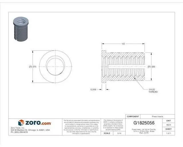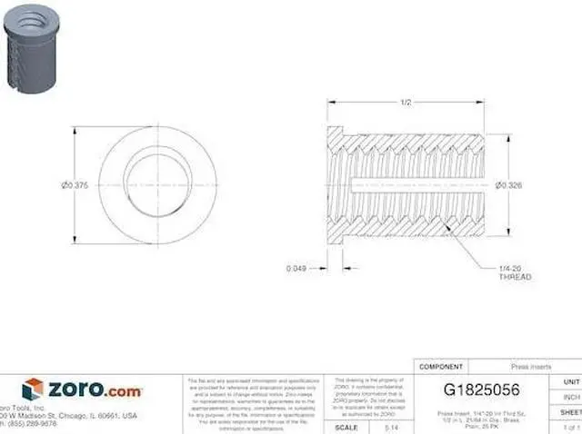 Press Insert, Insert Type Reverse Slot Press Insert, System of Measurement Inch, Overall Length 1/2 in, Insert Diameter 21/64 in, Thread Size 1/4 In. -20, Thread Direction Right Hand, Thread Type Coarse, Material Brass, Material Grade/Class C3604, Finish Plain, Flange Style Flanged, Body Texture Knurled, Number of Fins Not Applicable, Compatible Material Plastic, Drill Bit Size 5/16 in, Minimum Material Thickness 9/16 in, Maximum Hole Diameter 0.313 in, Manufacturer Location Globally Sourced. This item has been restricted from sale in the following state (s): []
