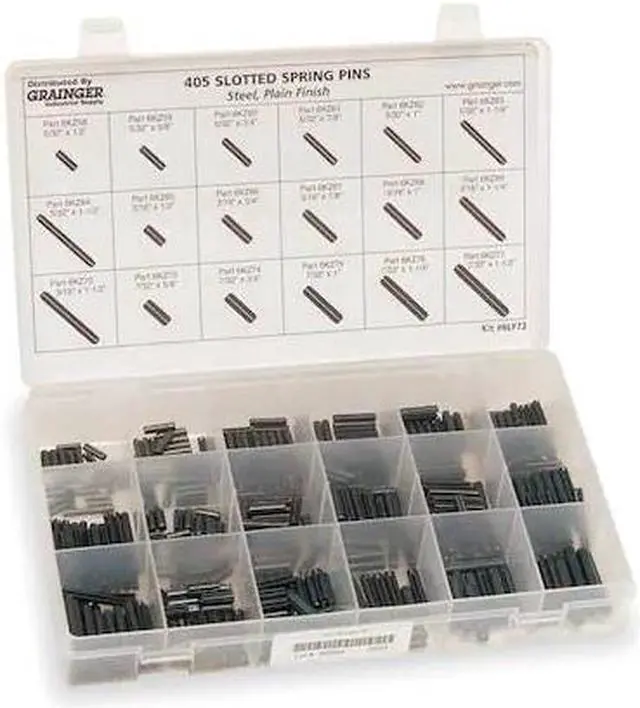 Pin Assortment, 405 pcs, 18 Sizes, Manufacturer Location Made in USA*, Made in North America Yes, Product Type Spring Pin Assortment, Material Grade/Class Ungraded, Standards ANSI, DIN, Military