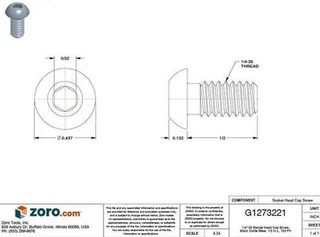 California Proposition 65: This product contains a chemical known to the State of California to cause birth defects or other reproductive harm. Socket Head Cap Screw, Head Type Button, System of Measurement Inch, Drive Type Socket, Drive Size 5/32 in, Material Alloy Steel, Finish Black Oxide, Thread Size 1/4 In. -20, Minimum Thread Length 1/2 in, Fastener Length 1/2 in, Head Height 0.132 in, Head Diameter 0.437 in, Pack Size Small Pack, Thread Style Fully Threaded, Special Features Not Applicable, Countersink Angle Not Applicable, Dimensional Standards ASME B 18.3, Flange Diameter Not Applicable, Flange Thickness Not Applicable. This item has been restricted from sale in the following state (s): []