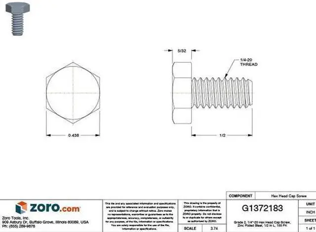 The ZORO SELECT - U08210.025.0050 is a Hex Head Cap Screw, a type of fastener with a hexagonal-shaped head used in various industrial applications to securely join materials together. This particular screw is designed for use in accordance with ASME B18.2.1 dimensional standards.