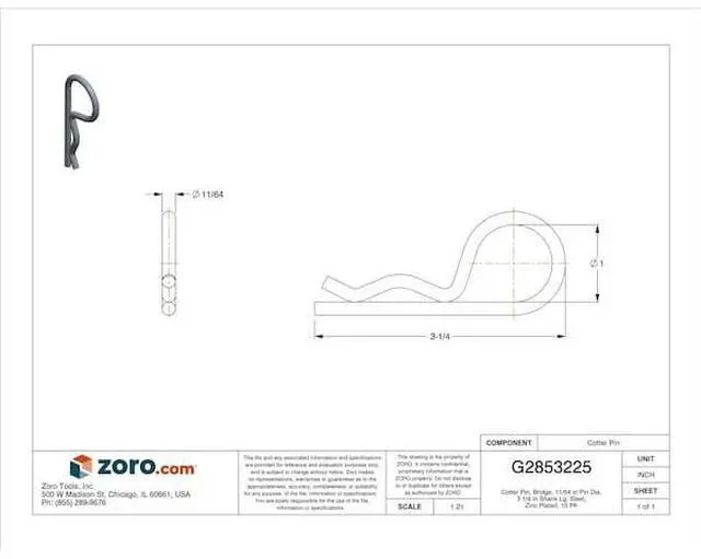 Cotter Pin, System of Measurement Inch, Cotter Pin Type Hairpin, Basic Material Steel, Fastener Finish Zinc Plated, Pin Dia. 11/64 In., Fastener Length 3-1/4, Fits Shaft Dia. 5/8 to 1 In., Meets/Exceeds ANSI/ASME B 18.8. 1, Package Quantity 10. This item has been restricted from sale in the following state (s): []