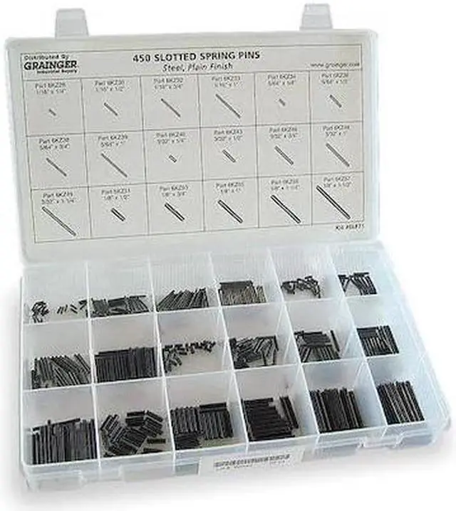 Pin Assortment, 450 pcs, 18 Sizes, Manufacturer Location Made in USA*, Made in North America Yes, Product Type Spring Pin Assortment, Material Grade/Class Ungraded, Standards ANSI, DIN, Military