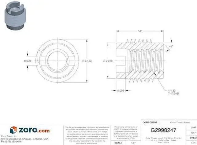 Knife Thread Insert, System of Measurement Inch, Insert Diameter 29/64 in, Overall Length 1/2 in, Internal Thread Size 1/4 In. -20, Thread Direction Right Hand, Thread Type Coarse, Material Brass, Material Grade/Class C3604, Finish Plain, Drive Type Slotted, Drill Bit Size 25/64 in, Compatible Material Wood, Minimum Material Thickness 1 in, Maximum Hole Diameter 0.391 in, Manufacturer Location Globally Sourced, Compatible with Grainger Part Number 4ZE54. This item has been restricted from sale in the following state (s): []