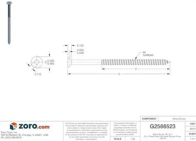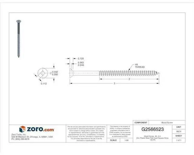 Wood Screw, Finish Zinc-Plated, Material Steel, Drive Square, Screw Size #8, Fastener Length 3 in, Head Width 0.332 in, Head Height 0.12 in, Drive Size #2, Threads per Inch 15, Thread Style Partially Threaded, Minimum Thread Length 3 43/64 in, Pack Size Small, Maximum Head Width 21/64 in, Minimum Head Width Not Applicable, Maximum Head Height 1/8 in, Minimum Head Height Not Applicable, System of Measurement Inch, Head Type Flat, Point Type Not Applicable, Dimensional Standards ASME B 18.6.