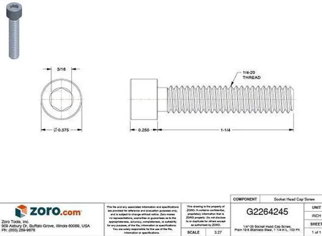 California Proposition 65: This product contains a chemical known to the State of California to cause birth defects or other reproductive harm. Socket Head Cap Screw, Head Type Standard, System of Measurement Inch, Drive Type Socket, Drive Size 3/16 in, Material Stainless Steel, Material Grade/Class 18-8, Finish Plain, Thread Size 1/4 In. -20, Minimum Thread Length 1 1/4 in, Fastener Length 1 1/4 in, Head Height 0.25 in, Head Diameter 0.375 in, Pack Size Small Pack, Thread Style Fully Threaded, Special Features Not Applicable, Color Silver, Countersink Angle Not Applicable, Dimensional Standards ASME B 18.3, Flange Diameter Not Applicable. This item has been restricted from sale in the following state (s): []