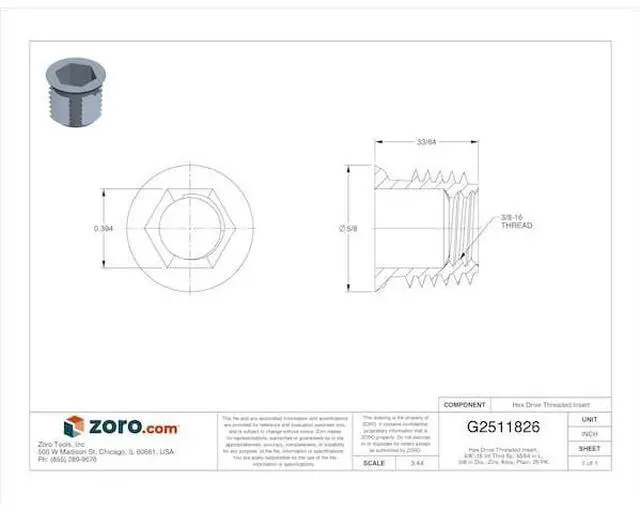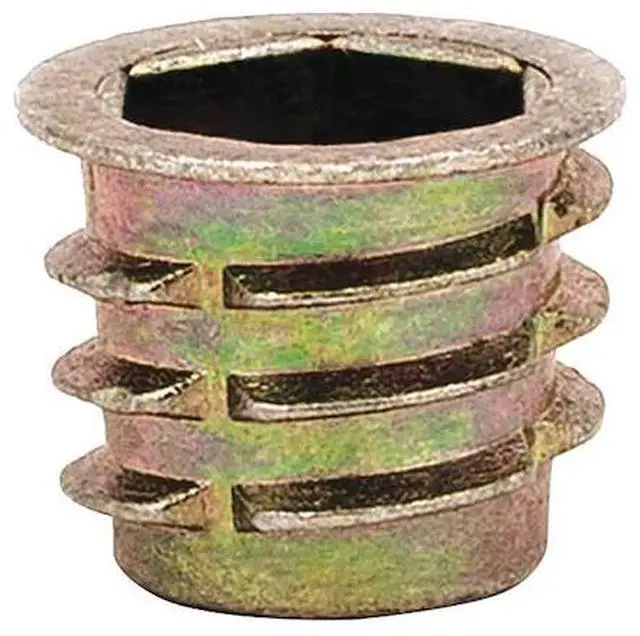 Hex Drive Threaded Insert, System of Measurement Inch, Insert Diameter 5/8 in, Overall Length 33/64 in, Internal Thread Size 3/8 In. -16, Thread Direction Right Hand, Thread Type Coarse, Material Zinc Alloy, Material Grade/Class Not Graded, Finish Plain, Drive Size M10, Drill Bit Size 15/32 in, Compatible Material Wood, Minimum Material Thickness 1 1/2 in, Maximum Hole Diameter 0.469 in, Flange Style Flanged, Manufacturer Location Globally Sourced, Compatible with Grainger Part Number 4ZY13. This item has been restricted from sale in the following state (s): []